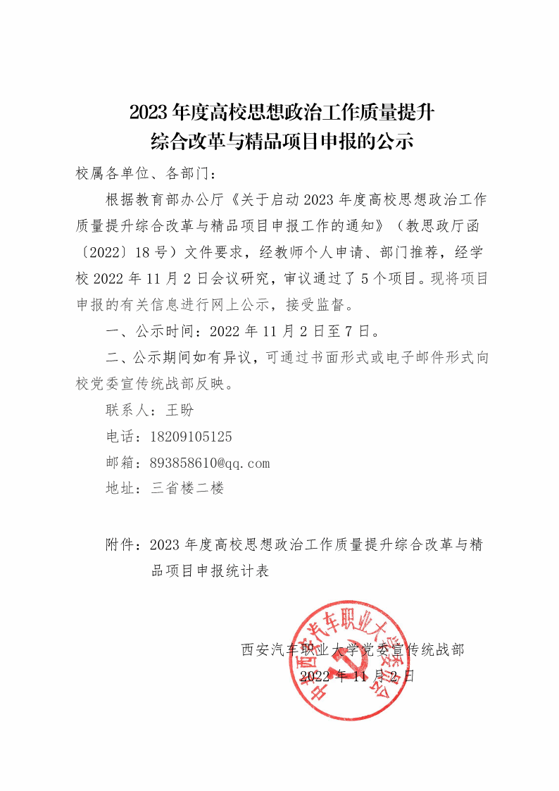 2023 年度高校思想政治工作质量提升 综合改革与精品项目申报的公示