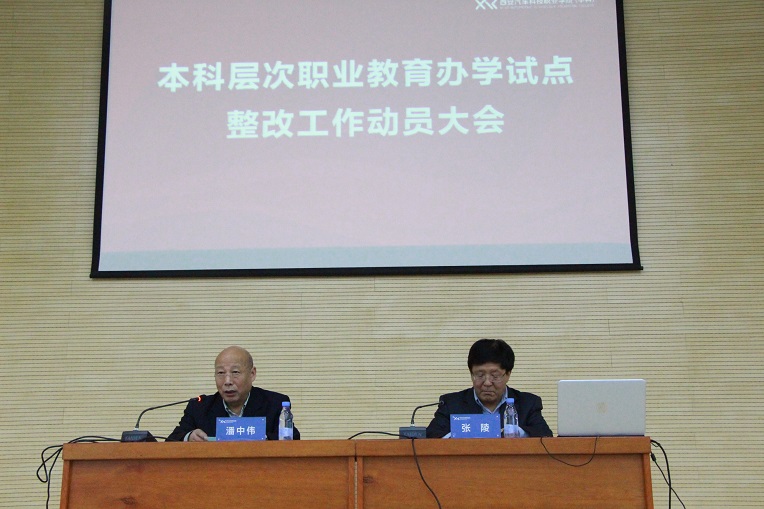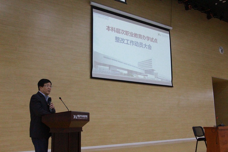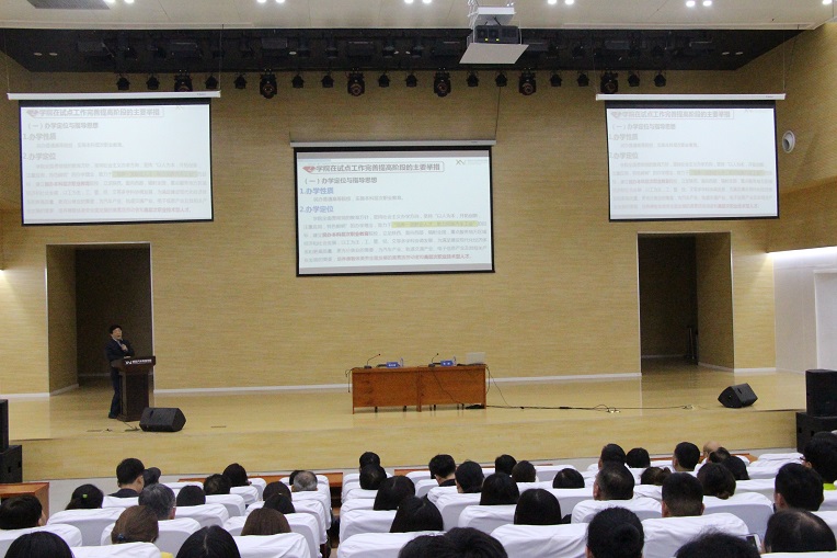 大会首先由执行院长潘中伟做冲刺阶段动员,他讲到:学院长久以来的目标就是培养国家需要行业需求的高素质技能人才,数年的努力就是为了让我们的职业教育再提高一个层次。对此在本科层次职业教育完善提高阶段,学院成立了专门的工作领导小组,从今年2月份开始,在专项工作小组的推进下先后开展了一系列对标教育部职教改革四项要求的自查整改提高工作。今天的动员大会就是为了对广大基层教师进行再宣传再动员,要让我们全员熟知学院在升本工作中开展的一系列卓有成效的工作,也让大家了解到更名这件事对我们学院,对我们每一位教职员工每一位学生的重大意义。