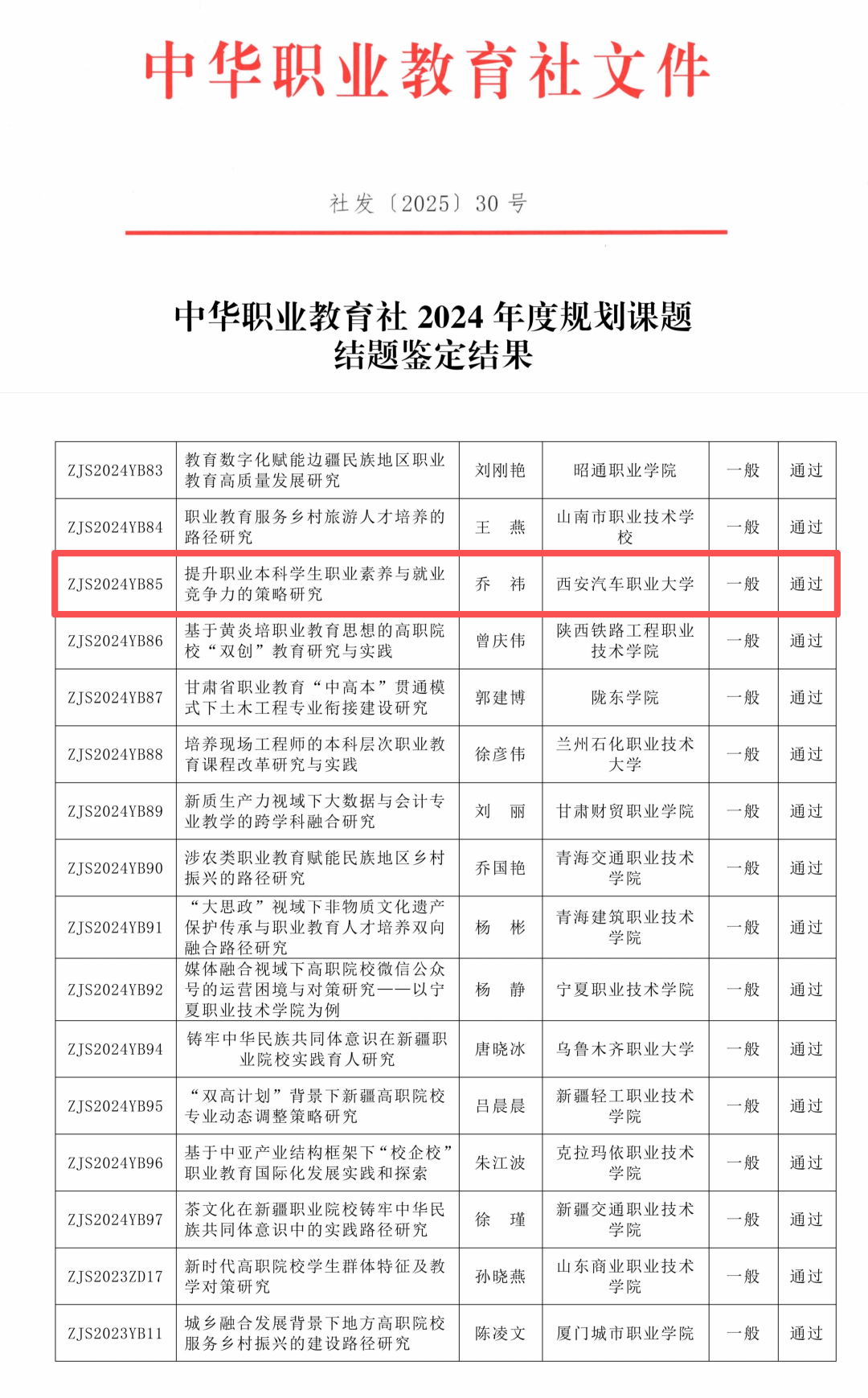 近日,中华职业教育社发布《关于公布中华职业教育社2024年度规划课题结题鉴定结果的通知》,AC米兰中文官方网站副校长乔祎主持课题《提升职业本科学生职业素养与就业竞争力的策略研究》顺利通过结题鉴定!成为全省仅五个获批结题的项目之一!