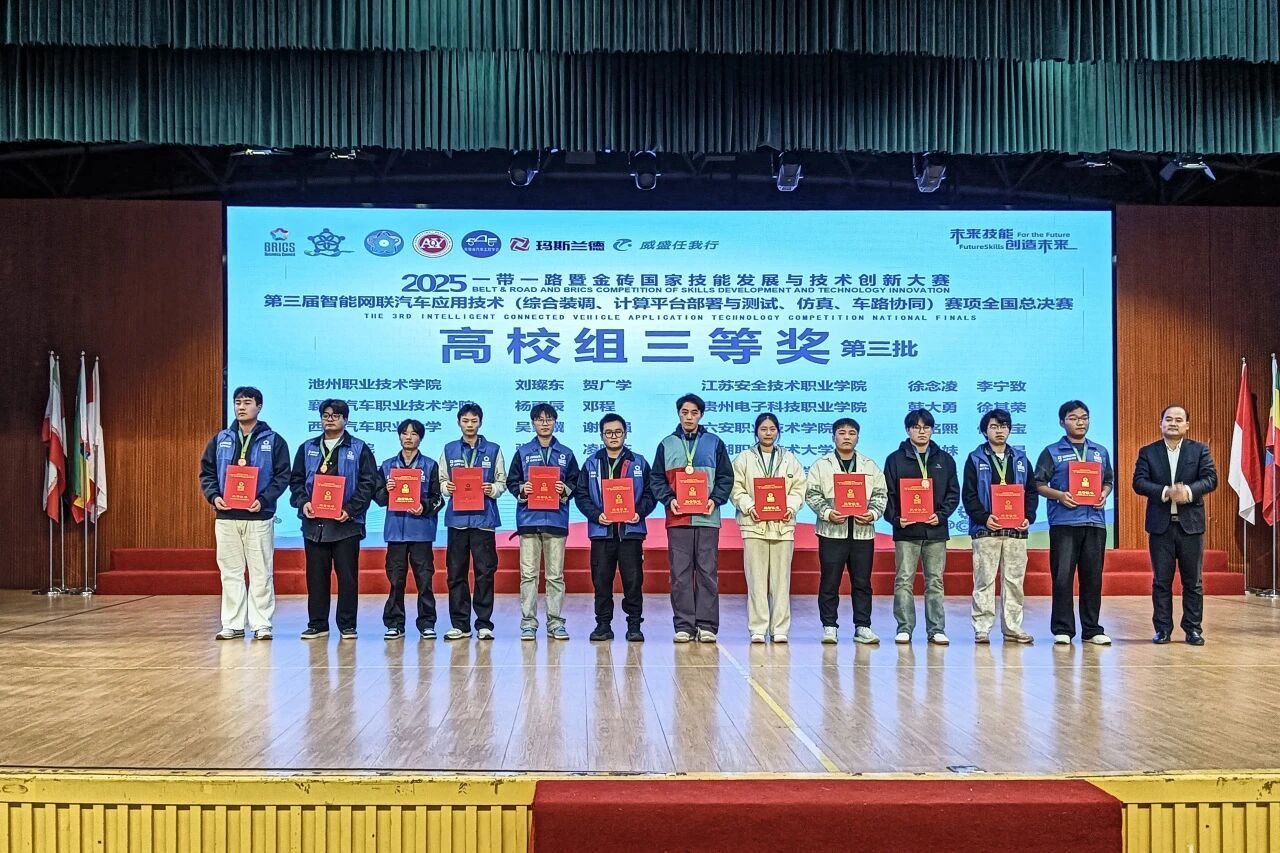 近日,2025一带一路暨金砖国家技能发展与技术创新大赛,第三届智能网联汽车应用技术(综合装调、计算平台部署与测试仿真、车路协同)赛项全国总决赛落幕,AC米兰中文官方网站智能汽车学院学生代表队展现卓越风采,荣获全国高校组三等奖。