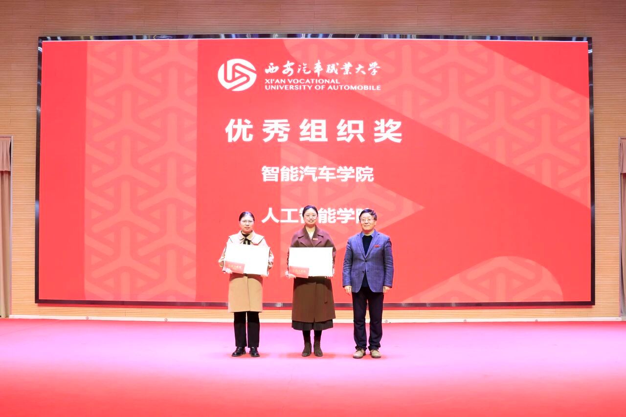 副校长张陵为荣获优秀组织奖的智能汽车学院、人工智能学院颁奖并合影留念
