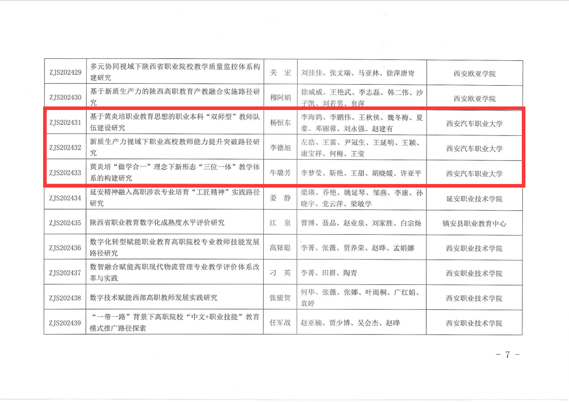 近日,陕西省中华职业教育社公布了2024年度职业教育课题立项名单,AC米兰新能源汽车学院杨恒东、交通工程学院李德旭、文理学院牛璐芳三位老师的课题获批立项。