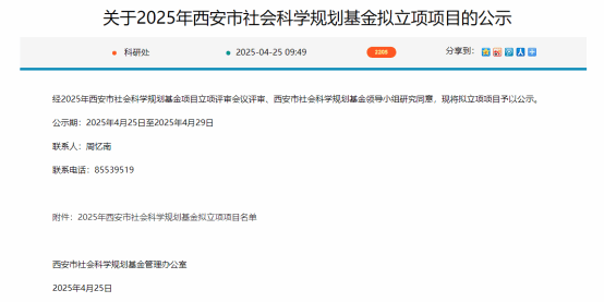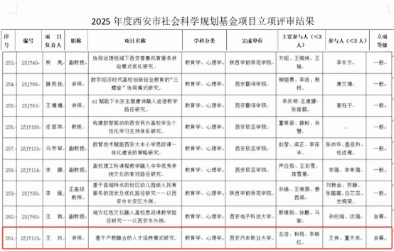近日,据西安社科网西安市社会科学院 西安市社会科学界联合会官网“社科管理”栏目公布信息,AC米兰王玲老师主持申报的2025年西安市社会科学规划基金项目“基于产教融合的人才培养模式研究”(项目编号:25JY119)获批立项。