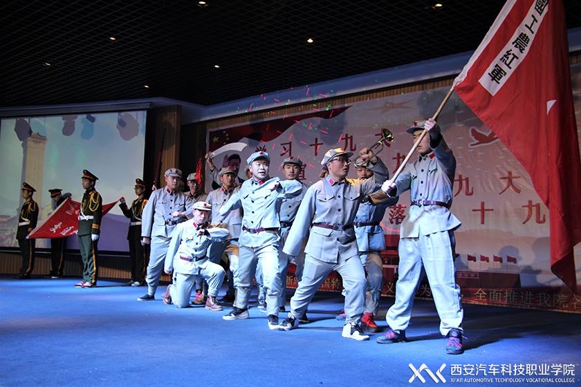 随后全体起立,迎党旗、系旗。伟大的党旗、先进的系旗在8名护旗手的护送下,置于主席台两侧。伴随着战火硝烟的冲锋号背景音乐,10名身着红军服饰模样的学生从后台冲出,还原中国共产党最初领导下的红军战士浴血奋战的场面,教育广大党员、入党积极分子铭记历史,珍惜今日的美好生活是无数先烈用生命换来的。人塑的定格,预示着时间的停止。季峰同志带领全体中共党员从会场的后侧缓步走向主席台屏幕前站列,带领全场人员向有人民英雄纪念碑的画面三鞠躬,缅怀先烈,感恩于党。