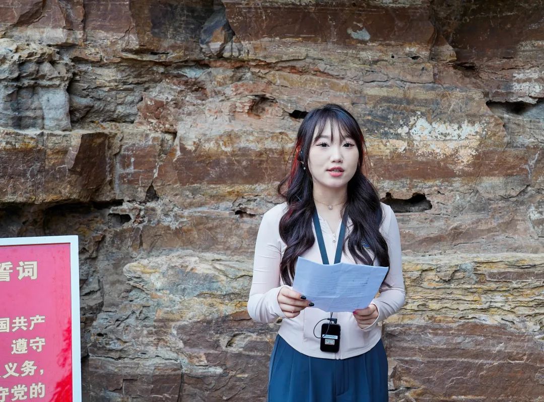 在红旗渠咽喉工程青年洞前,学员们在实践团团长张力心的带领下,向着雄伟壮丽的太行山,向着蜿蜒流淌的红旗渠,向着鲜红庄严的党旗,集体重温了入党誓词,铮铮誓词回荡在太行山谷中,让大家的心灵得到进一步净化,党性修养得到进一步提升,干事创业劲头得到进一步激发。之后校内宣讲团成员贾雪祺作为学生代表进行了发言。