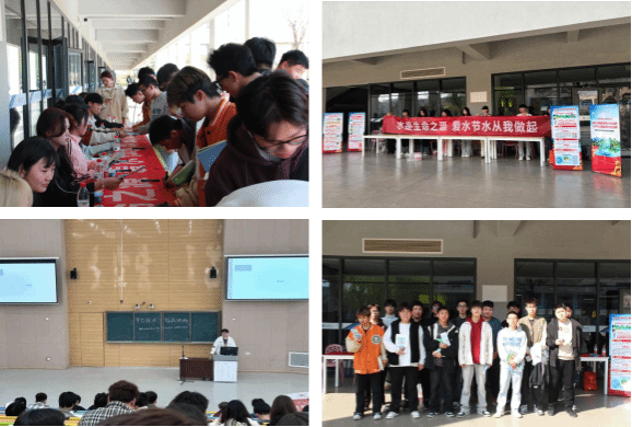 3月21日下午,在校园廊桥四周,挂起了“珍惜水 保护水 节约水 创建节水型高校”、“人人参与节水爱水 共建绿水青山家园”、“龙头打开水哗哗 转身莫忘关掉它”等节水主题宣传条幅;在校园人流量大的餐厅门口,立起了“世界水日,中国水周主题宣传画”“节水、用水知识”等宣传展板;向在校师生发放“节约用水漫画小常识”、“节约用水行为规范”等宣传册。路过学生纷纷驻足阅读学习,拉着小伙伴们在“水是生命之源 爱水节水从我做起”的横幅上一起签名合影留念并领取金属钥匙挂钩节水纪念品。