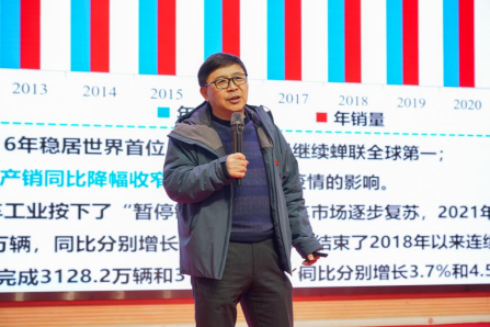 讲座开篇,余强副校长从世界汽车产业起源切入,详细阐述了汽车发展历经的单件生产期、装配流水线、多品种生产方式、精益生产方式四大阶段,重点解读了当前正处于的电动化、智能化、网联化、共享化第四次变革浪潮。他通过详实数据展示,近70年来全球汽车产量从1950年的1000万辆增长至2024年的9250万辆,虽受疫情短暂冲击但快速复苏,印证了产业的强大韧性。在国内发展部分,余副校长将中国汽车工业划分为输入、初创、成长、高速发展、驶入快车道五个阶段,回顾了从1956年第一辆解放牌汽车诞生到如今产销量连续16年稳居全球首位的辉煌历程。他特别强调,2010年以来,在国家政策支持下,中国新能源汽车产业实现跨越式发展,90%新能源汽车实现国产化,比亚迪、宁德时代等企业跻身全球行业前列,“三电”技术达到世界先进水平。